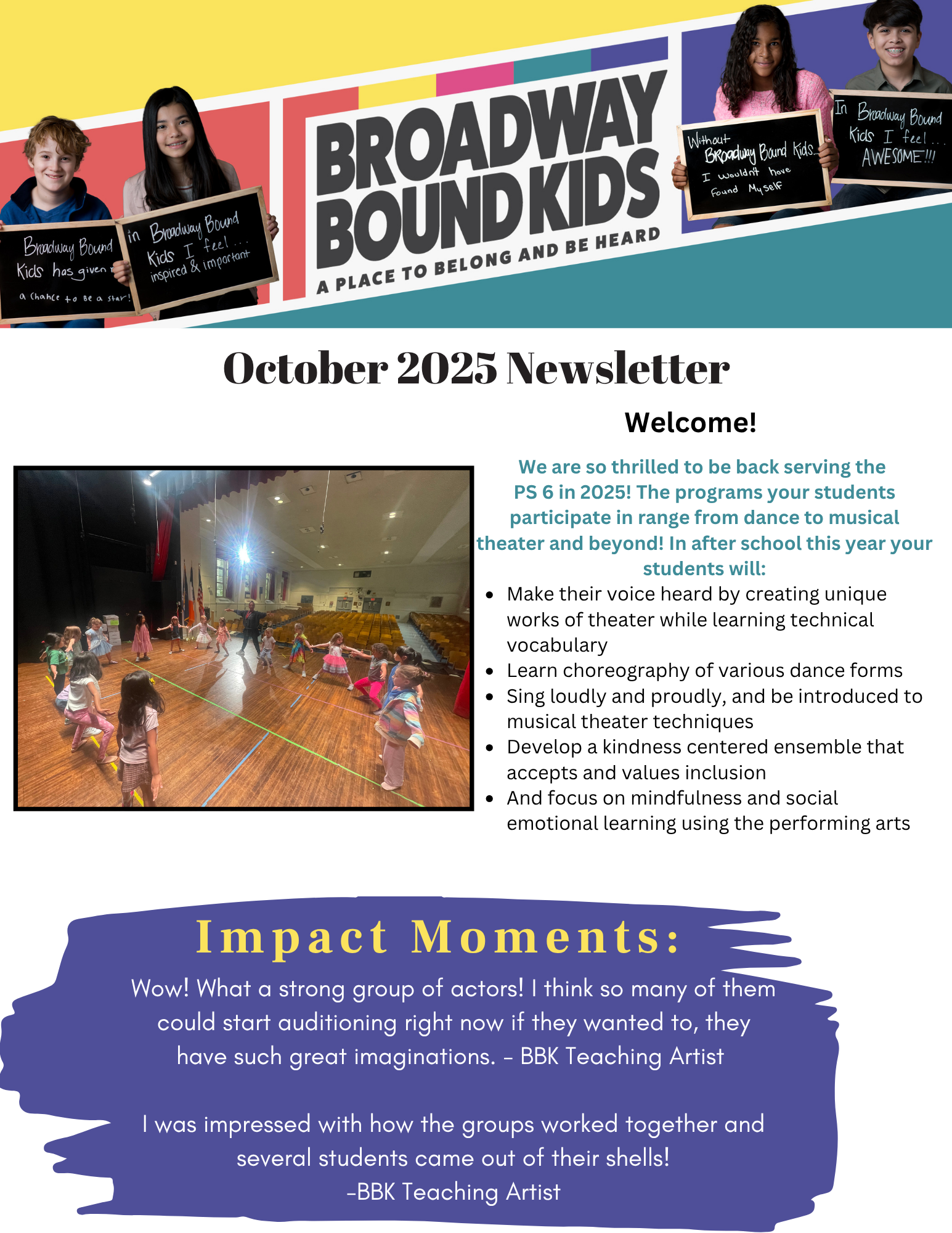 We are back! Find out what PS 6 participants have been up to this month. Performing arts education is integral to students’ creativity, confidence, social emotional learning, and academic motivation. We can’t wait to share how all of these values are echoed in the PS 6 programming.